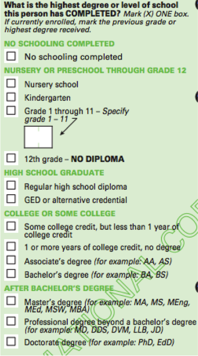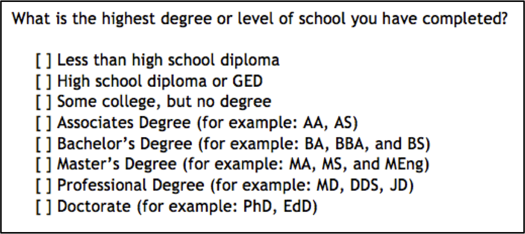This example also asks the respondent to select his/her “highest degree completed,” as this type of question often does. Completion of a high-school education does not lead to a degree but rather a diploma. (I’ll withhold an additional grammar discussion related to the word “diploma” for now. ) The response options related to finishing high school or having completed some college are not completed degrees, but progress towards high-school diplomas or other degrees. These comments might seem nit-picky, it is possible that respondents “get” the badly worded questions and precision isn’t needed for backend analysis. This issue can be easily avoided, especially when question wording could be borrowed from another source.